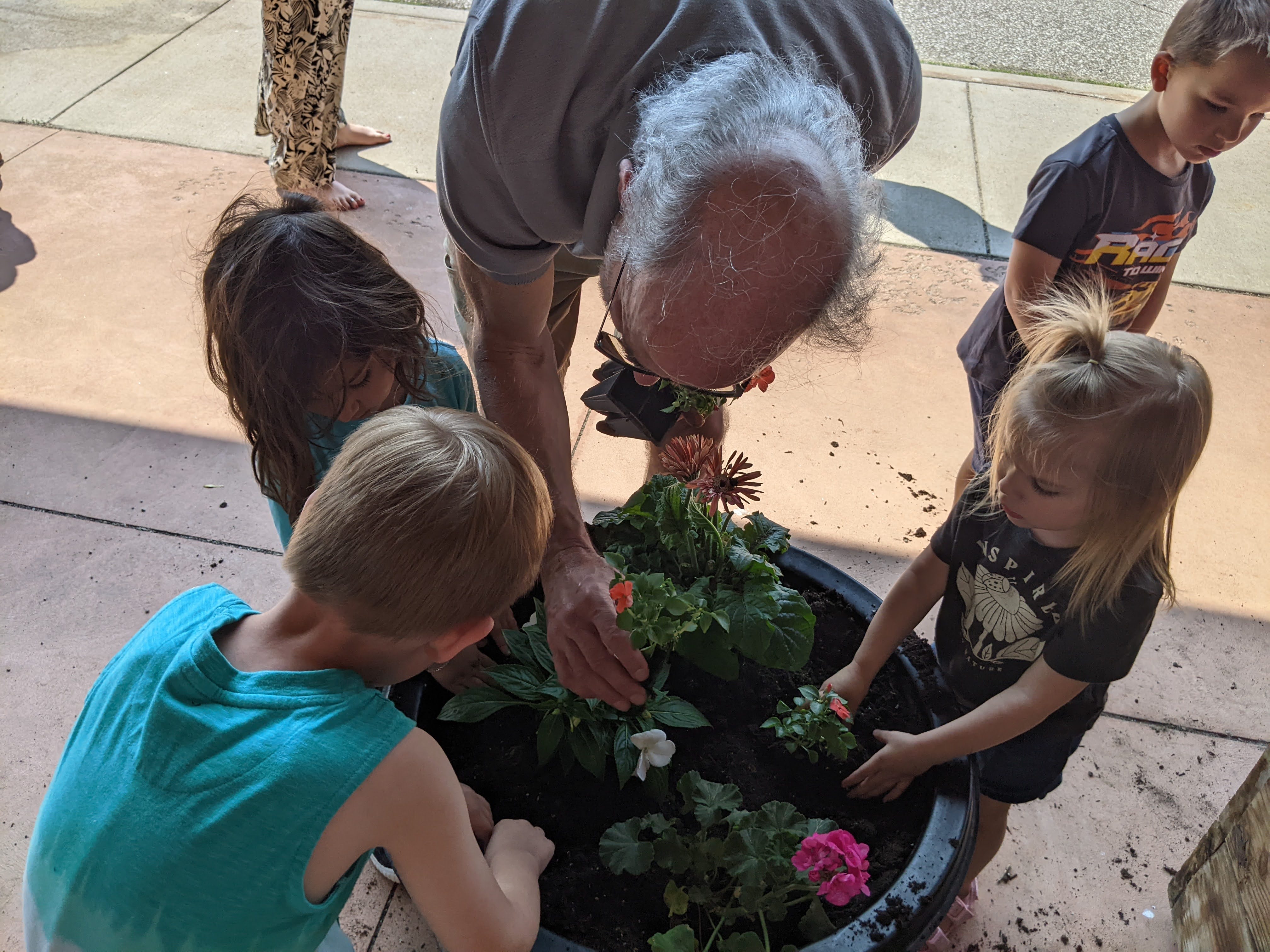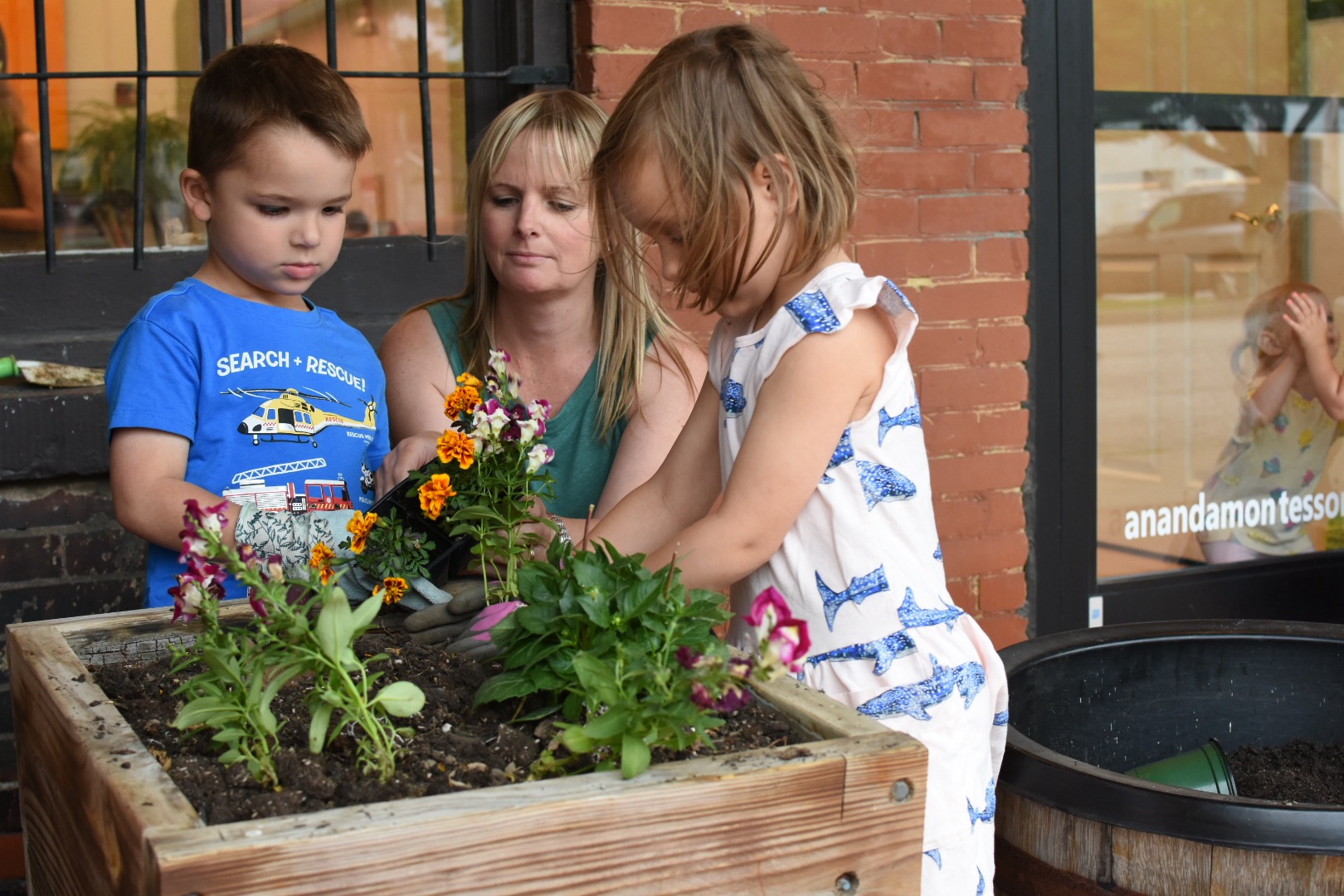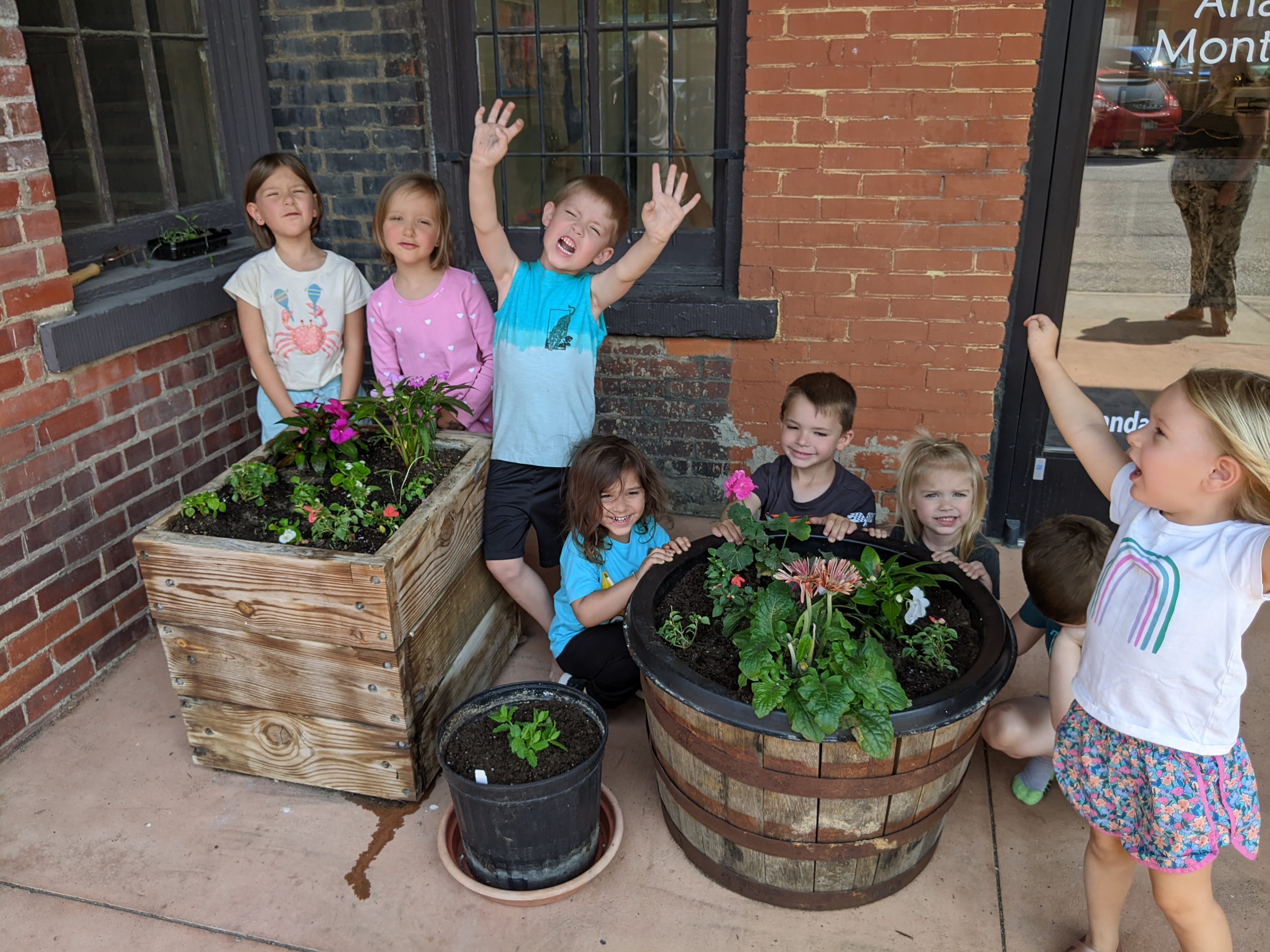 As part of our botany study we chose flowers to plant, prepared the soil, arrranged our design, and atttended to the needs of the plants. The children and adults love this annual event, as well as taking care of the flowers throughout the growing season.